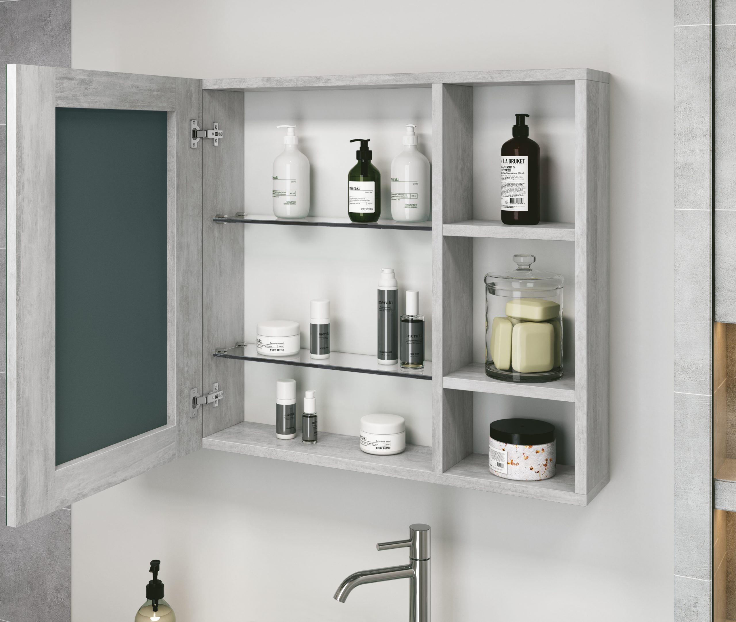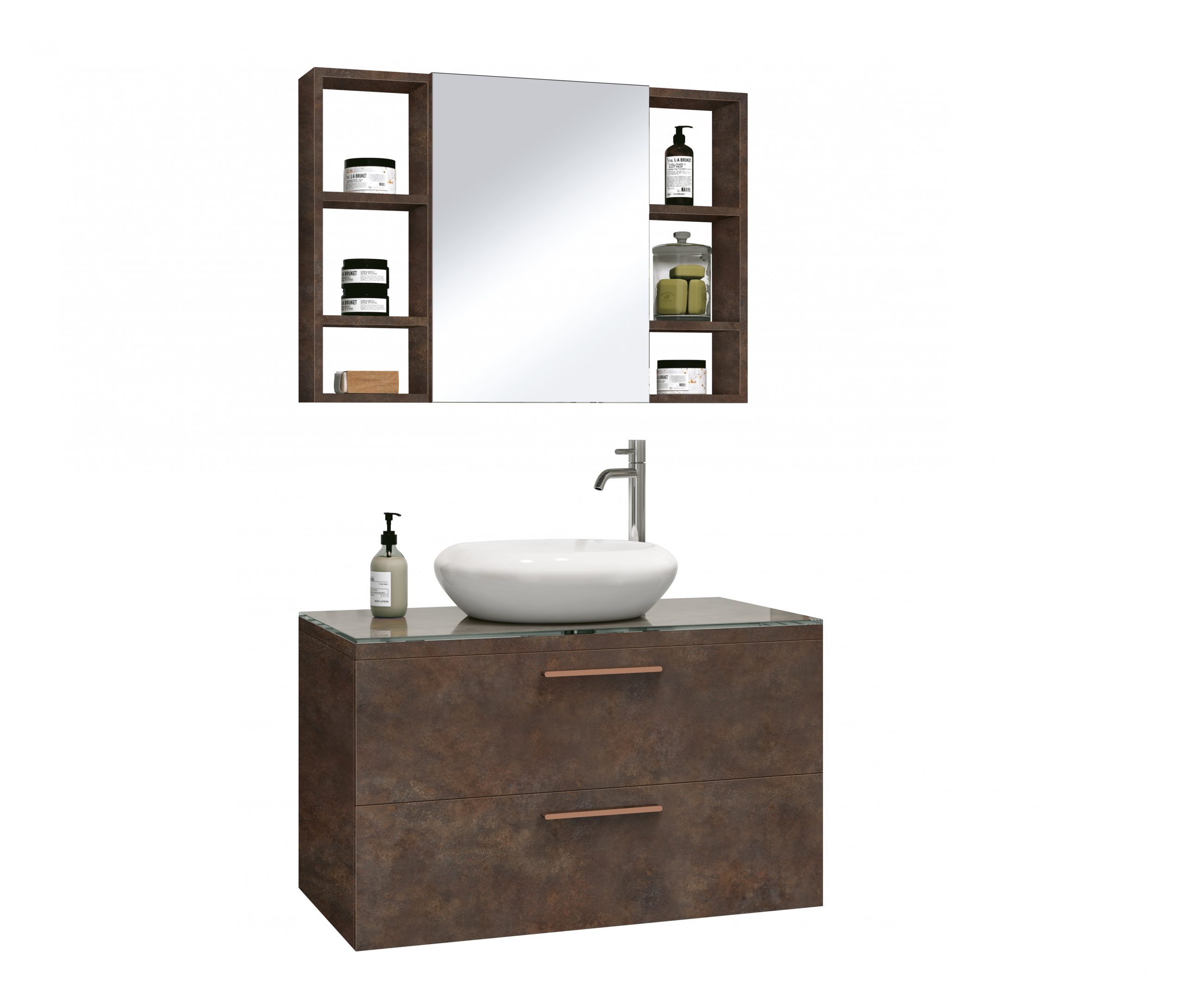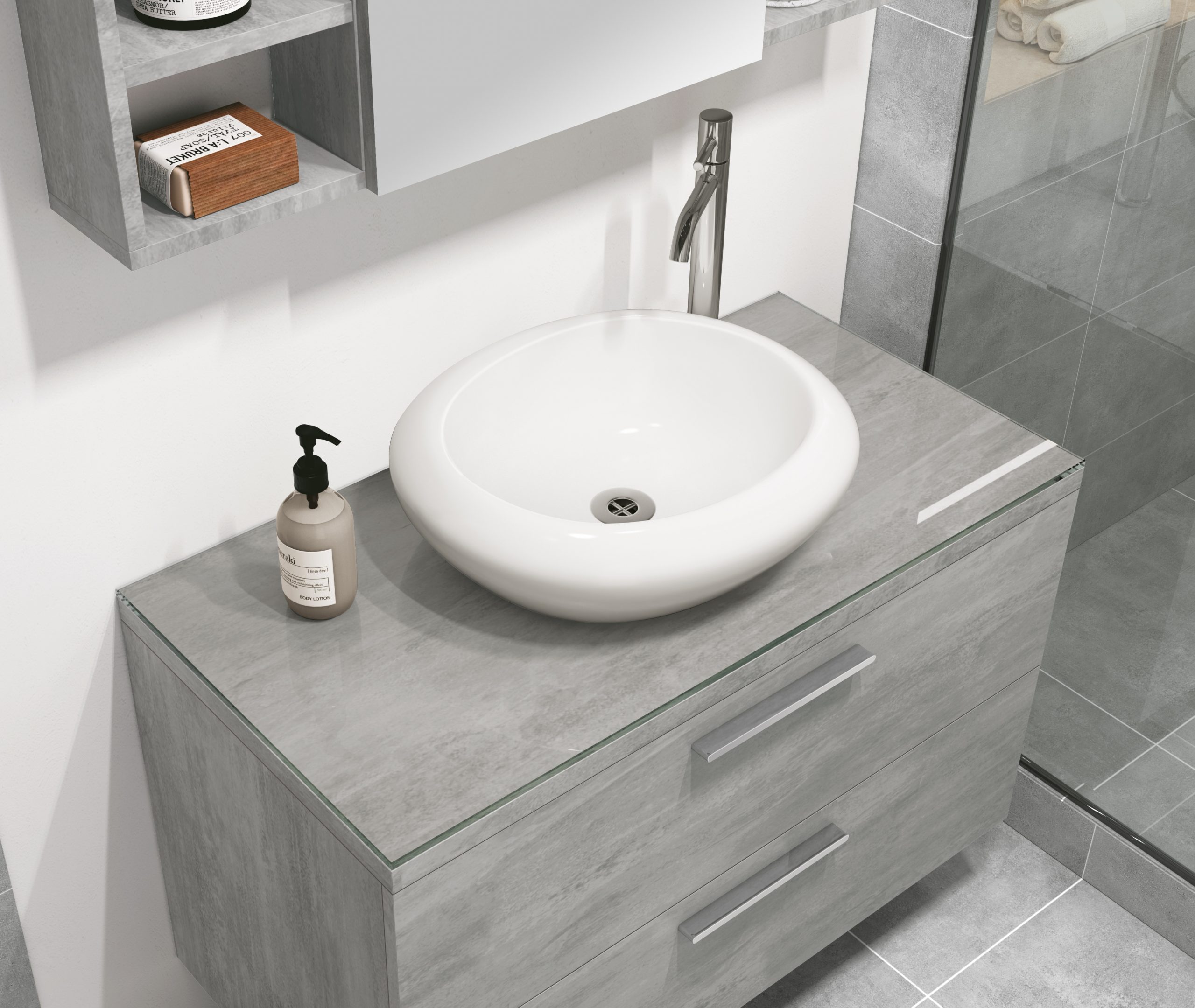 Espelheira Santorini – Prateleira vidro de 6mm, dobradiças reforçadas com sistema Slow que garante maior estabilidade e amortecimento ao fechamento de porta.